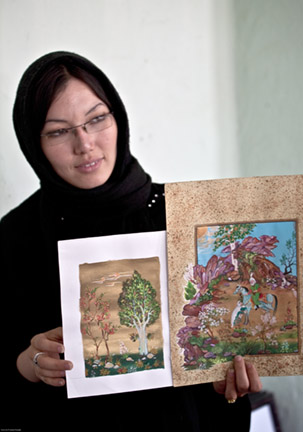 The young women learn traditional Afghan art such as miniature painting as well as working to create a new form of Contemporary Afghan art.