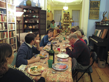 Thanksgiving is one of my favorite holidays. For me in means many family members of all different ages around a table. Growing up we would go over the bridge and through the woods to my Grandmother’s house where we never could get every one around the table.  We always hoped that we would have graduated to sit at the adult table however when you are one of the younger ones no mater how old I was there never seemed to be enough room. So in my house everyone was around the table as we pushed our furniture aside and borrowed tables and chairs from friends and neighbors.  Priscilla Frisbee, my 94 year old mother was at the head of the table. Astrid sitting on her father’s lap (her mother is standing) was the youngest.  It was mostly longtime friends who are my neighborhood family who I am so grateful to know.